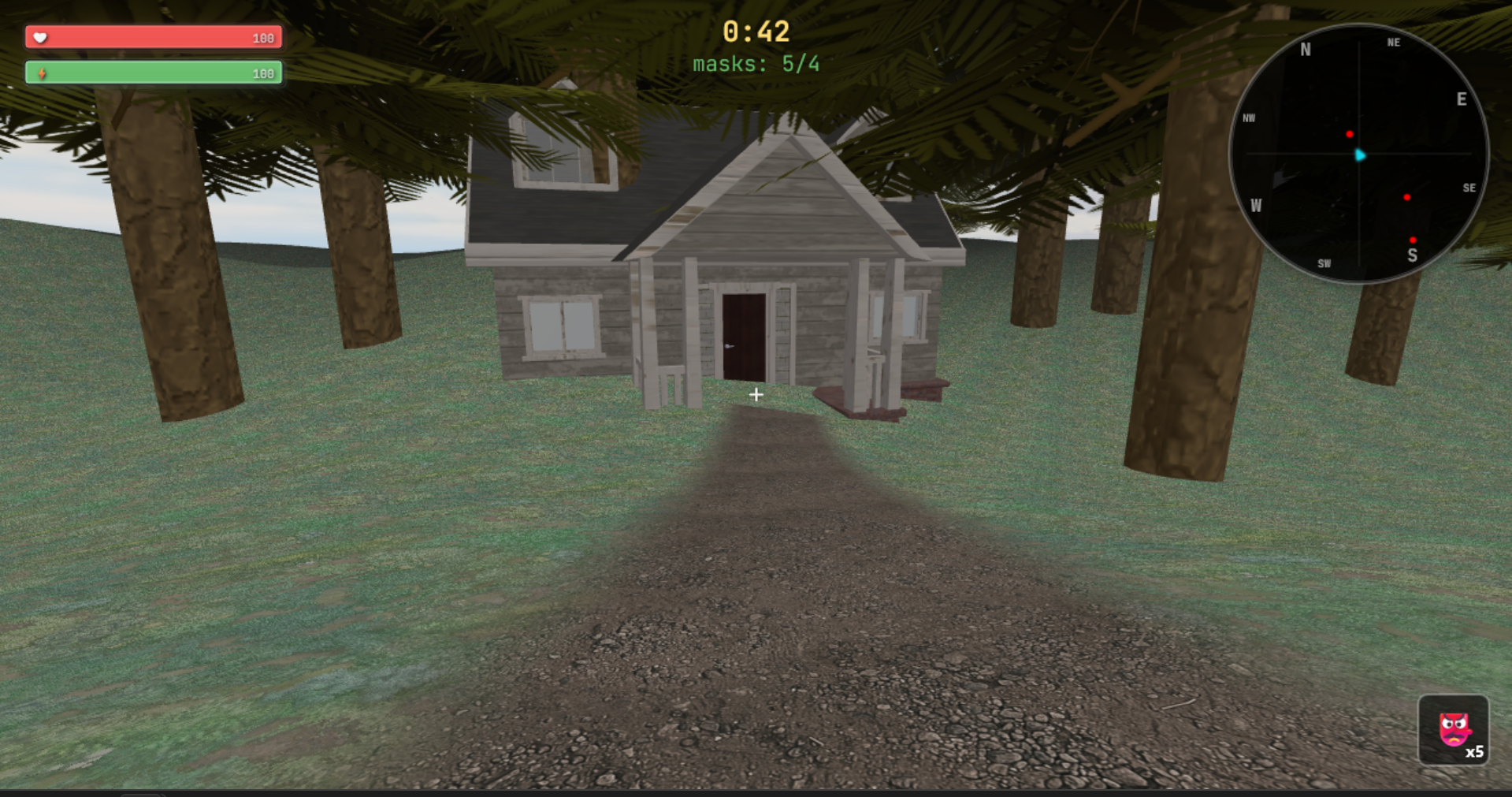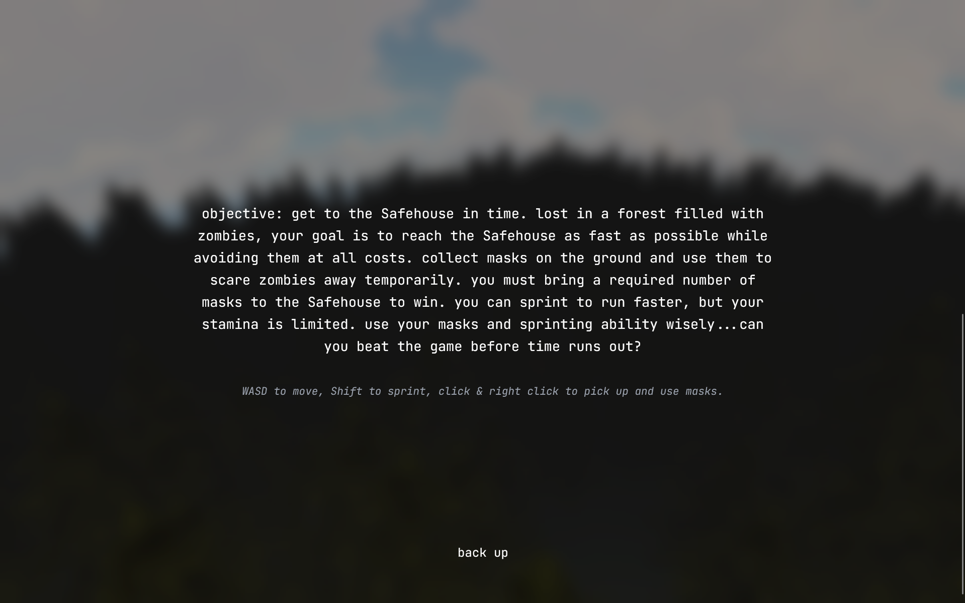 objective: get to the Safehouse in time. lost in a forest filled with zombies, your goal is to reach the Safehouse as fast as possible while avoiding them at all costs. collect masks on the ground and use them to scare zombies away temporarily. you must bring a required number of masks to the Safehouse to win. you can sprint to run faster, but your stamina is limited. use your masks and sprinting ability wisely...can you beat the game before time runs out?